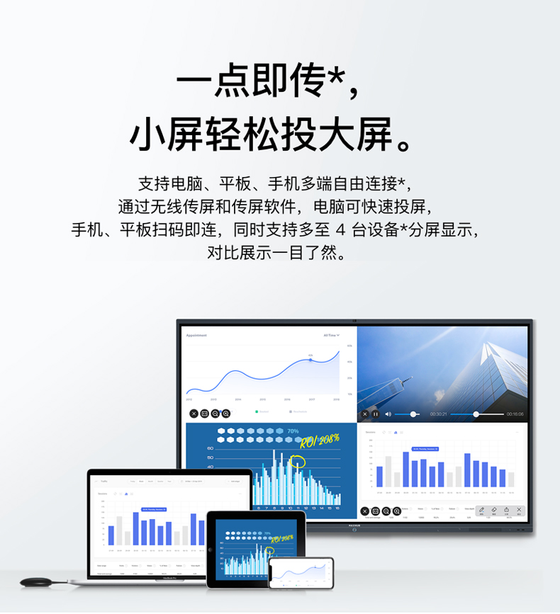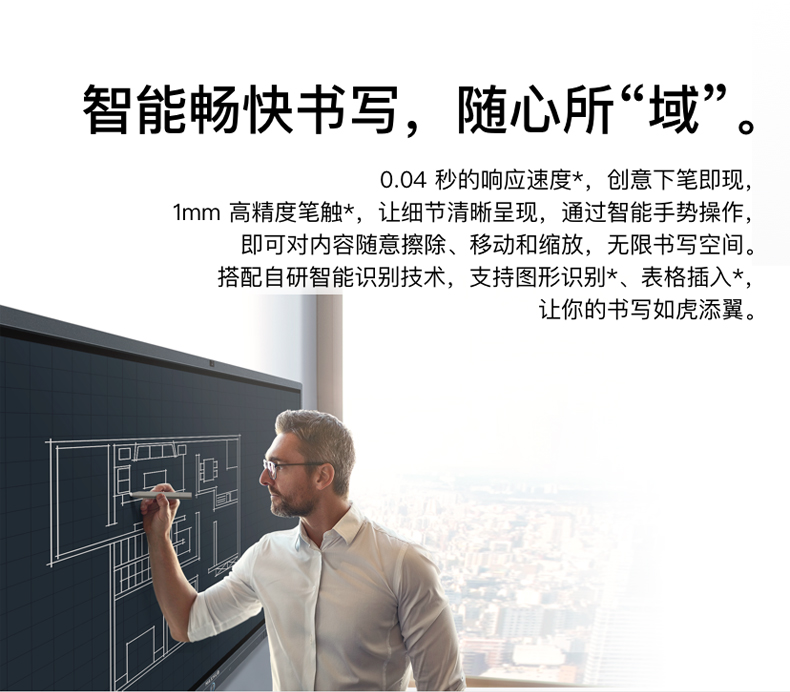 紅外+電磁雙控,4K高清, 無線傳屏,1024級壓力感應 0.5mm書寫精度 0.04s超快響應,智能圖表。55/65/75/86英寸